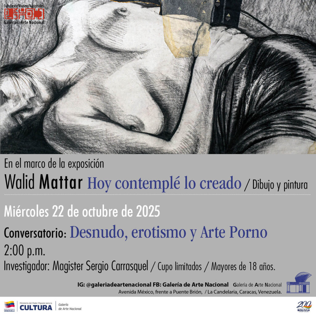 En el marco de la exposición “Hoy contemplé lo creado” del artista venezolano Walid Mattar, que se presenta actualmente en la Sala 1 de la Galería de Arte Nacional (GAN) bajo la curaduría de Fabiola Gámez, se llevarán a cabo una serie de actividades gratuitas los días 22, 25 y 26 de octubre de 2025, como parte de la programación que acompaña la muestra.